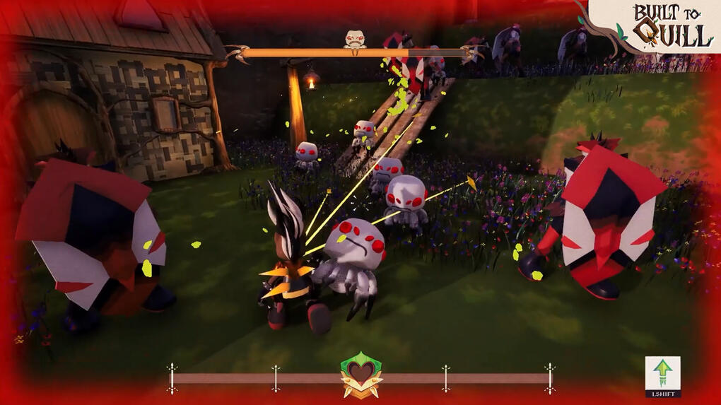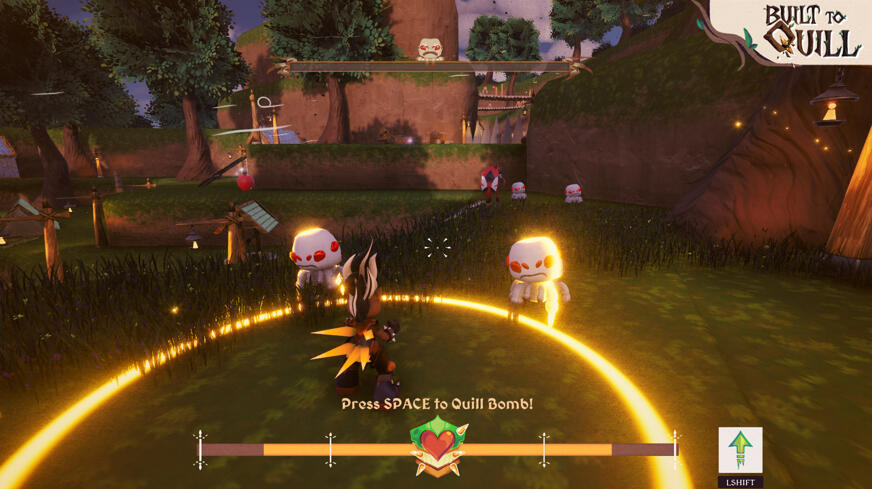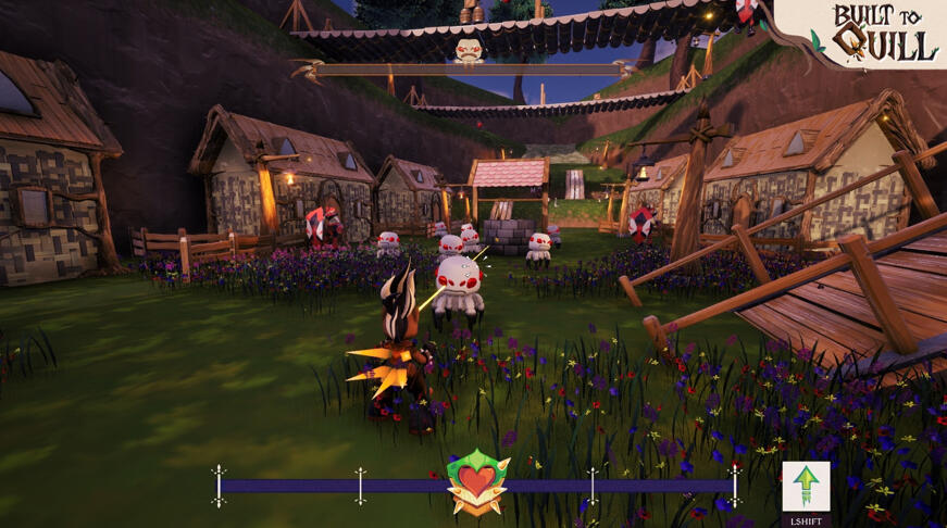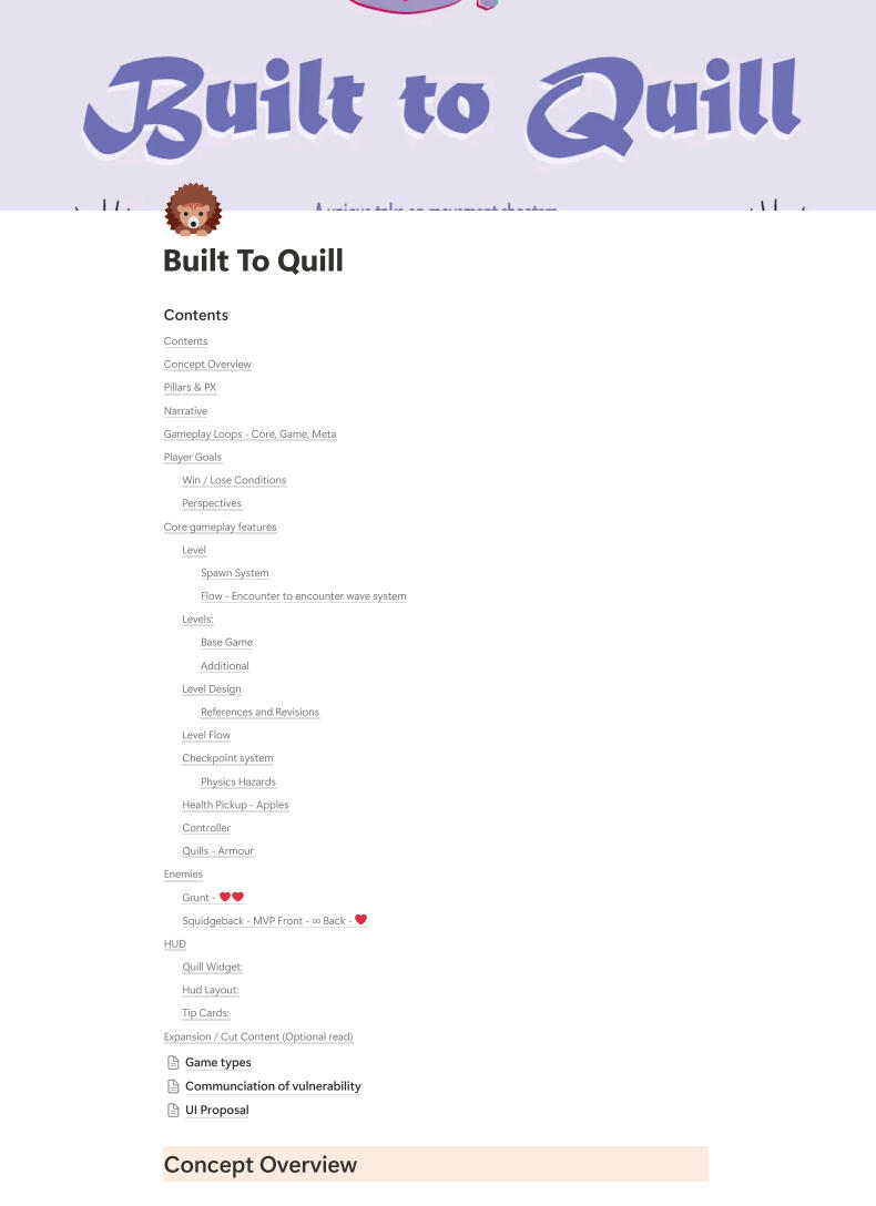 “Built to Quill” is a collaborative game development project by team Cosmic Cat. It is a third-person, strategic movement shooter for PC where you play as a porcupine reclaiming their village by battling waves of enemy bugs. This game’s development involved the phases of production using the AGILE game development process.I did this project for my DES315 professional project module, with all of the different games courses and disciplines at Abertay. For this project, my main role was the team’s designer, and my secondary role was programmer. We were working for an industry client 4J studios.“Built to Quill is a third-person, strategic movement shooter for PC in which you play as a porcupine who has lost her entire village to the wrath of the bugs. In the slaughter, you made it out. But not intact. With your quills all gone, you have spent your time away preparing for revenge, crafting an armour that covers your fragile body, one that allows you to attack en masse.““Repel quills at enemies with the ability to attract them back, dealing damage both ways. This armour adds even more quills than was previously thought possible by all porcupine kind, but don’t get too excited… your ammo is your armour. Although your enemies hit hard, with your armour you can quill out, and reclaim your village now that you are Built to Quill.”