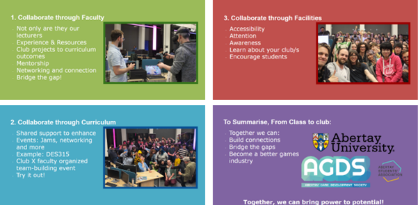 Also how we here at Abertay have worked with lecturers to collaborate through coursework and vice versa with the DES315 Professional Project module led by Mr Martin Lynagh.