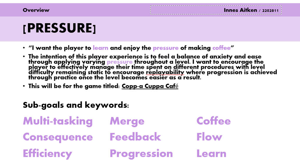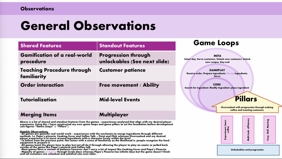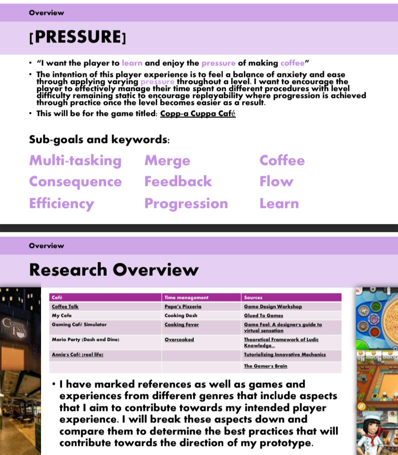 From my research, I highlighted shared and standout features to understand how these games can apply pressure in a way that feels unique to the player and fun to engage with.I then took this and labelled the best practices for myself to take into making my own prototype: Copp-a Cuppa Cafe