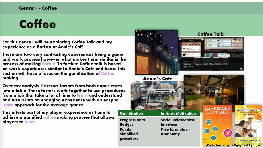 For this section, I had looked at my experiences as a barista and a game called Coffee Talk and compared these experiences to understand the gamification of coffee making and achieving intrinsic motivation within the player to have fun partaking in ideas that come from a retail job.Time Management Deconstruction: