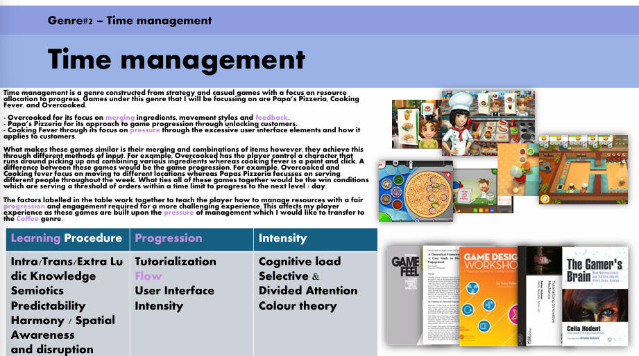 The next section I covered was about time management within games such as Overcooked, Papa’s Pizzeria and Cooking Fever to understand the concepts of Learning Procedure, Progression and Intensity as ways of applying and maintaining pressure in a game.