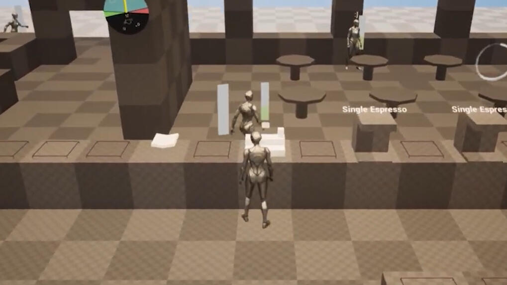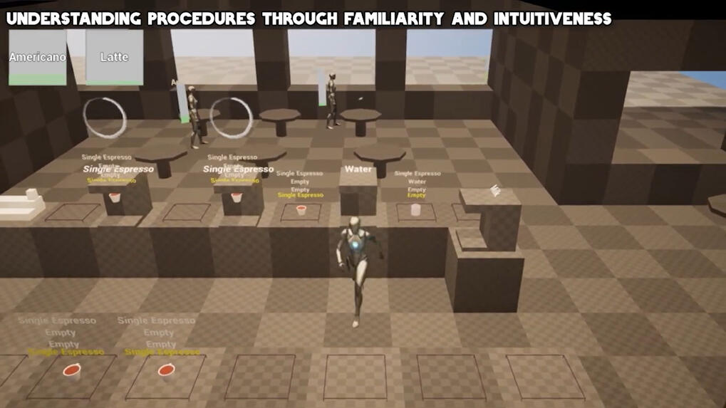 This is a coffee-making game where you play as a Barista in an understaffed cafe and you have to do everything yourself.For this I wanted the player to feel a balance of anxiety and ease through applying different levels of pressure throughout a level. From this, the goal for the player is to effectively manage their time and learn through replaying the levels and perfecting their strategy in order to progress.The game’s losing condition is to disappoint 3 customers by not making their drink correctly or taking too long to create it. The win condition is to make all the drinks that you can whilst staying under the 3 mistake threshold.Customers appear and wait at the till where the player will need to interact with them to take their order and they will go to find a place to sit.The game works off a merging mechanic where different machines create different ingredients such as espresso, water, milk etc… you must combine these to form different drinks. For example, an espresso + milk + milk = Late.A focus for me was to take advantage of familiarity a player can have across games or transludic knowledge by making sure ingredients would be communicated effectively and coffee recipes can be guessable. There is also a recipe book with icons but that takes time to read!