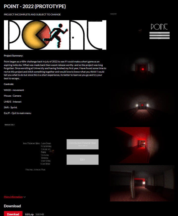 Point began as a 48-hour challenge in July of 2022 to test the skills I learned during my time in college. I was fascinated by how much I achieved in the jam and wanted to smooth out the player experience. During my first year of university, I made time to expand the project and further exercise my skills. I would love to revisit this project in future.Point is a horror remake of Pac-Man where the points (pellets that Pac-Man eats) are people and you are the last one. You must navigate an uncanny hotel corridor in search of safety from the creature that follows. Don’t let the lights go out!