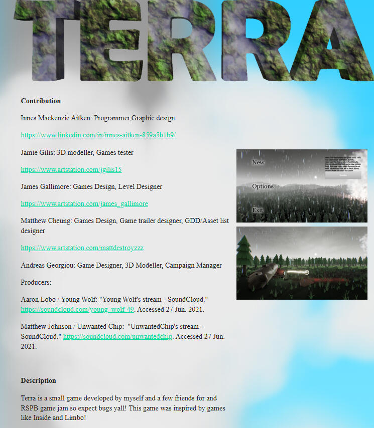 Inspired by games such as Inside and Limbo, Terra is a side-scrolling game in which players have to navigate the world by solving puzzles. Eventually, there is a final boss fight.I made this game with some classmates over a month for a charity game jam for Royal Society for the Protection of Birds. It was my first ever game jam, so I learnt a lot.It was play-tested by my college peers, which was a success. Looking back, it is quite simple, but I’m extremely proud of it as both my first group project and my first game jam.Aim of the game: Explore the wilderness, solving puzzles to survive as you quest to discover who is destroying the environment. Beware, there is danger ahead!
