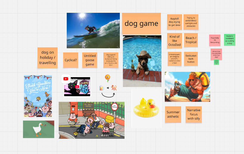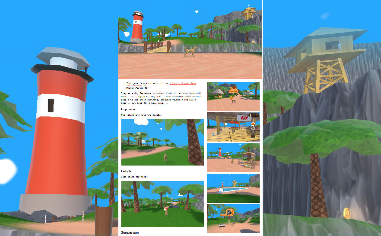 "Sun Dog" is a game submission made as part of a 8 person inter-disciplinary team for the Hub world Summer Game Jam Jamboree 25 with the theme of Factor 50.For this project I had a goal of working on my skills in production and leadership with a strong curiosity into the process of team formation and talent acquisition. For this my primary role was production with design as a secondary role."Play as a dog desperate to quench their thirst over some cold beer... but dogs don't buy beer. Trade sunscreen with sunburnt people to get their clothing, disguise yourself and buy a beer... but dogs don't have money...Explore - The island and meet the locals!