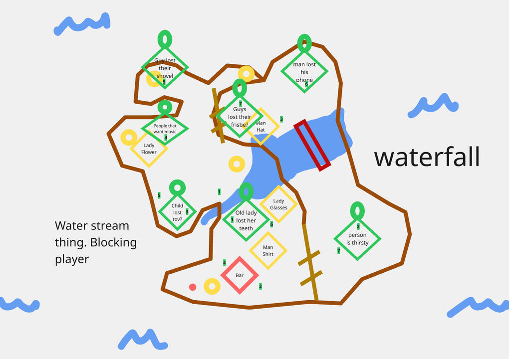 The only design work required of me for this jam was iterating on the level for the programmers and artists to work with when setting up and blocking out the level.Artifacts we had to take into consideration for our game were things like object placement especially for a game without a tutorial, the natural flow we were to create had to onboard the player. This was a cheap alternative than creating a separate level or in depth mechanics to teach the player how to play.Some notable objects we had set up were NPC positions and their desired items. Coin positions and balancing in order to complete the game whilst enticing the player to complete all option quests.