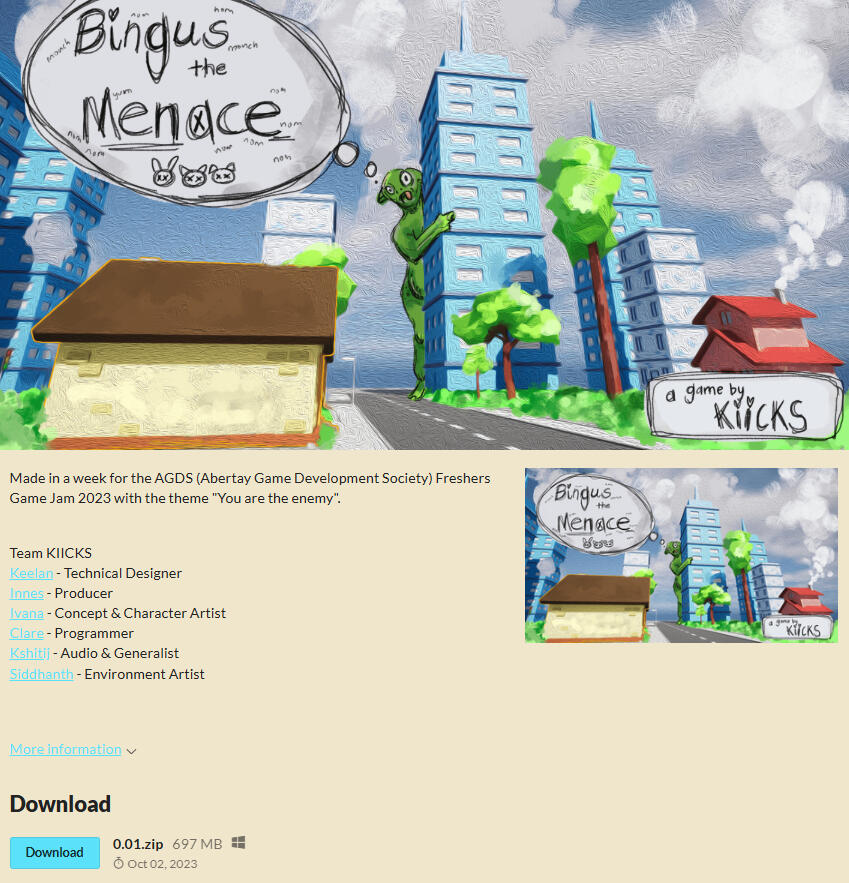 You play as Bingus, a big, green monster who, like the rest of us, must eat to live. Unlike us, his diet consists strictly of cute, fluffy animals. You must keep his hunger from running out by rampaging through the town and eating any creature in sight!Showcase to Industry: