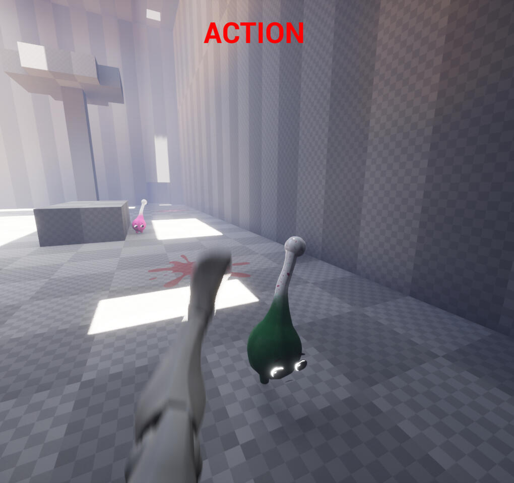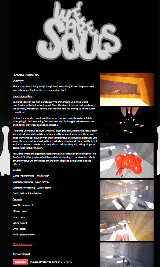 We are souls is a first-person, round-based survival game. What started as a funny voice message to throw out a concept became a short but sweet game about kicking waves of angry bowling pins. Alongside 3 of my classmates, I completed this project over the summer after my first year of study. We had 4 days (1 day planning. 3 days production) to execute this idea. This took place in August 2023.The aim of this project was to exercise the skills we gained from out first year of study and put them to test within a short time frame.Aim of the Game:Enter a world crawling with adorable ‘souls’ that will stop at nothing to strike fear. These pocket-sized troublemakers squish, wobble, and squeak as they try to knock you off your feet! Hold onto your sides because, when you pluck them up by their tails, their squealing and cursing grows in absurdity.‘We Are Souls’ dares you to keep upright and have a ball as you come foot-to-face with waves of audacious critters. Grab ‘em, throw ‘em, punt ‘em to daze ‘em and don’t forget to swing ‘em to slap the others!