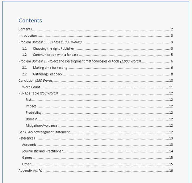 Within this case study, I highlight the risks can face during development for a hypothetical game studio for an 18-month production time for their game project. I go on to discuss potential issues within Business and project / development methodologies and tools by talking about ideas such as maintaining mutual interest with a publisher, communication with a fanbase, testing with said fanbase and ensuring you have the time to achieve this.Business: